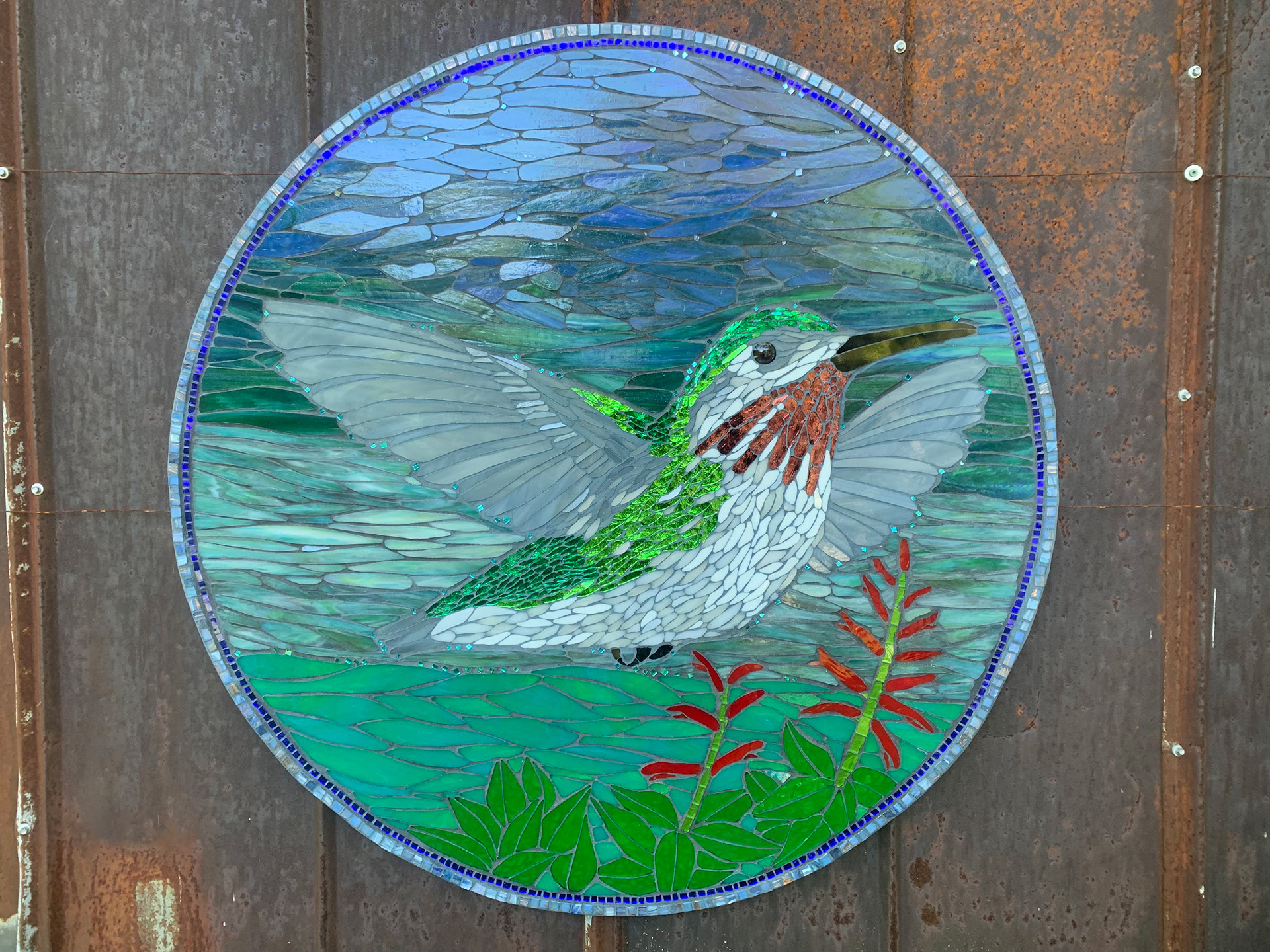 Calliope Hummingbird Mosaic is made of hand-cut stained glass and colored Italian mirror glass. Hummingbirds are active in early morning, depicted here with a river behind the clients' home. The Selasphorus calliope is a rare type of hummingbird with distinctive purple feathers. The mosaic was inspired by a repeat visitor to the clients' garden over several years. They named him Calvin.