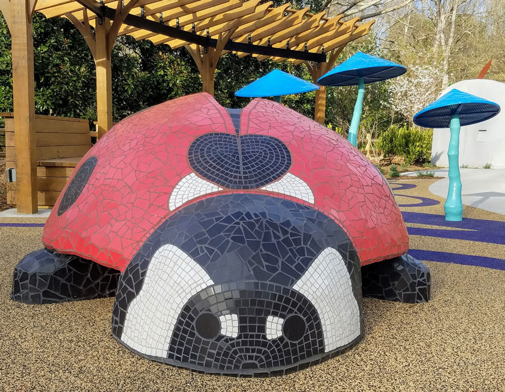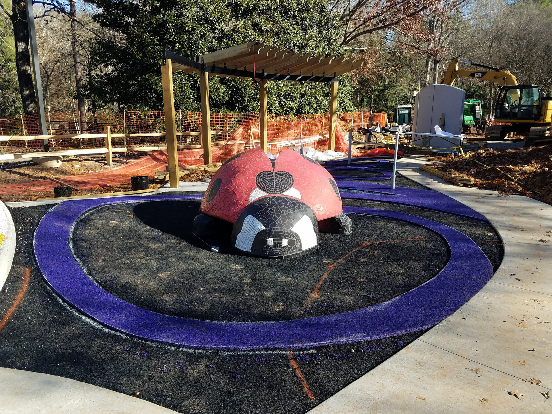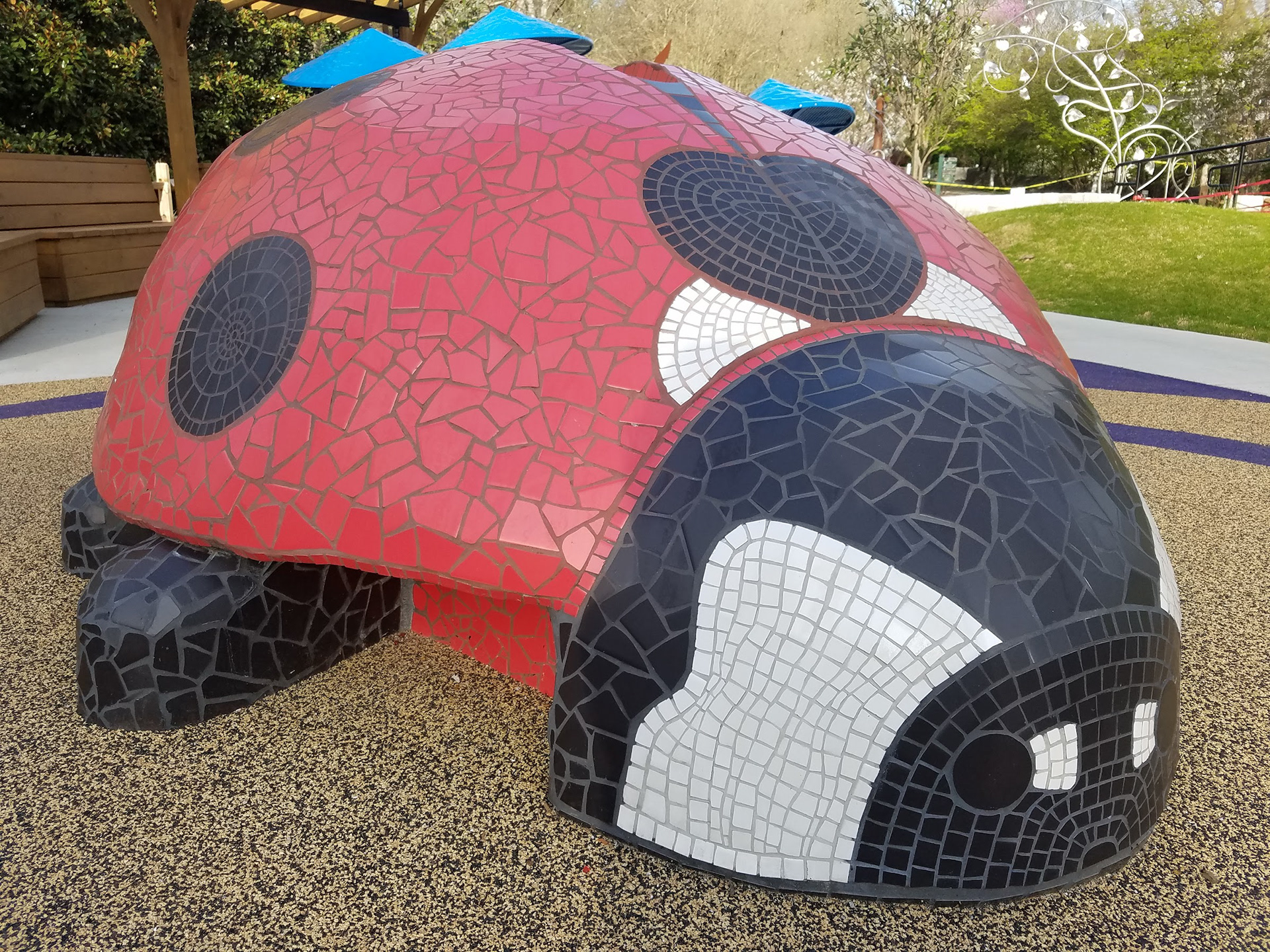 The Giant Ladybug, located at the heart of the Children's Garden, was designed by Koons Environmental Design (along with everything else) and fabricated by a subcontractor prior to on-site mosaic work (in a range of weather)
