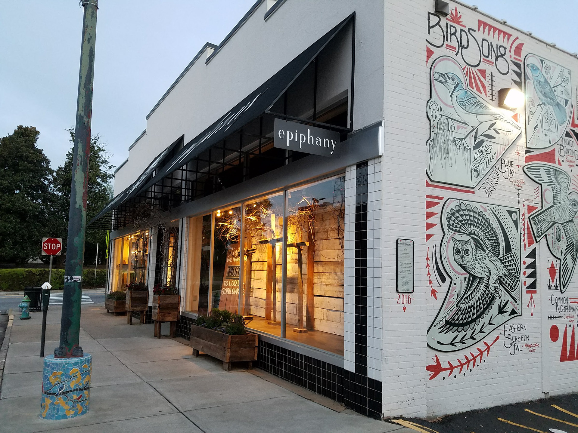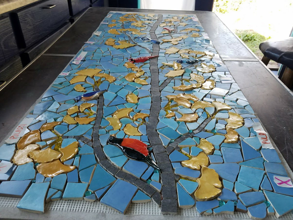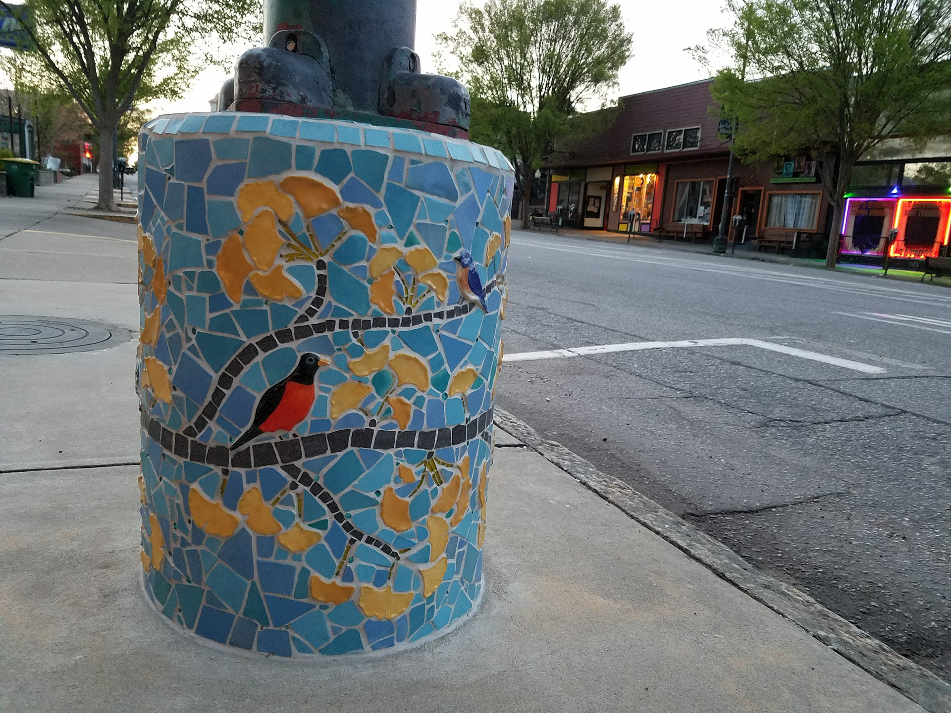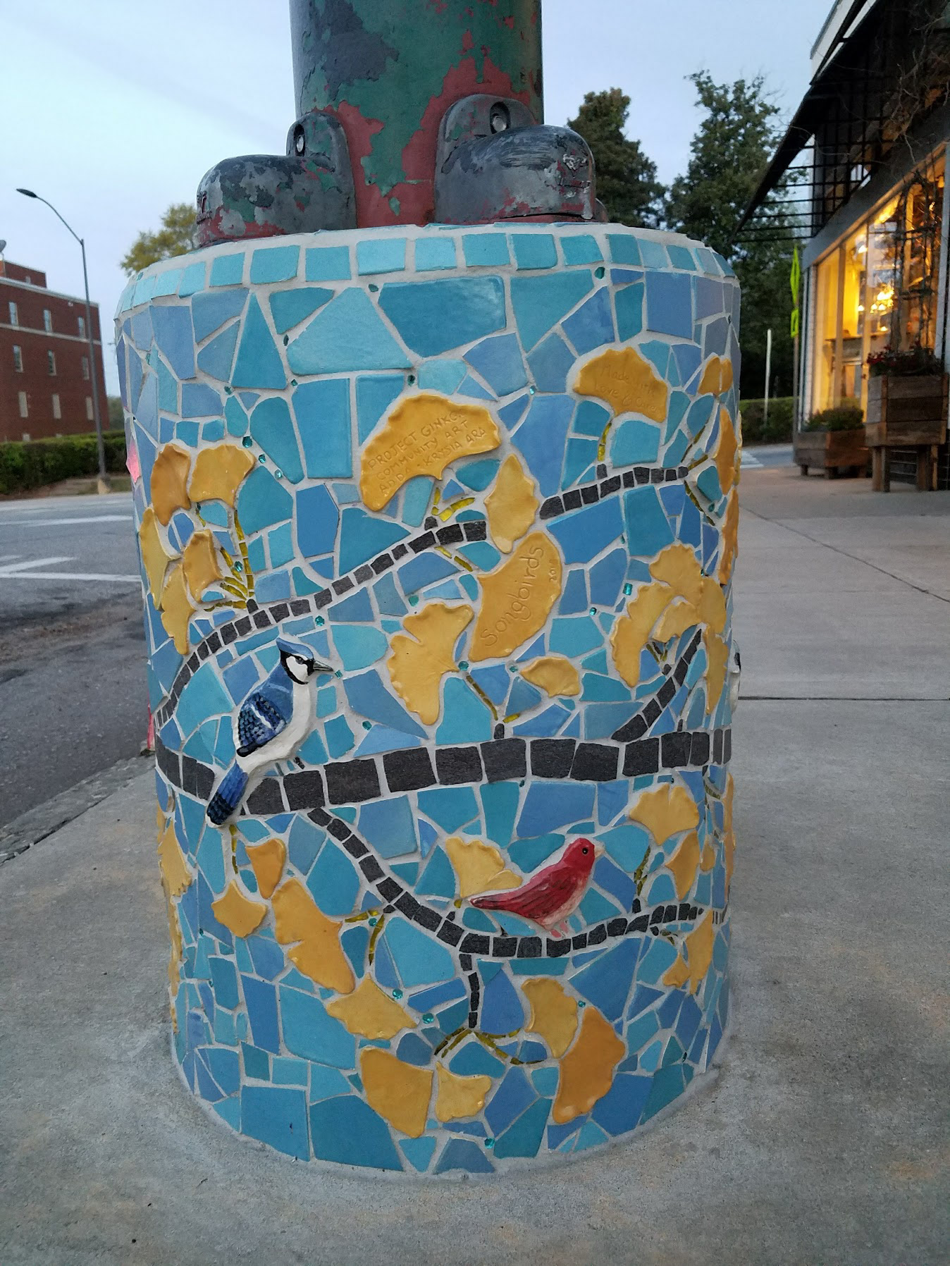 Ginkgo Songbirds was inspired by local artist David Hale's "Birdsong" mural, which can be seen above. I included some of the birds featured in that project. Birdsong was a temporary mural that included a series of panels, now replaced by an even better bird-themed mural also by Hale, full of vibrant colors.